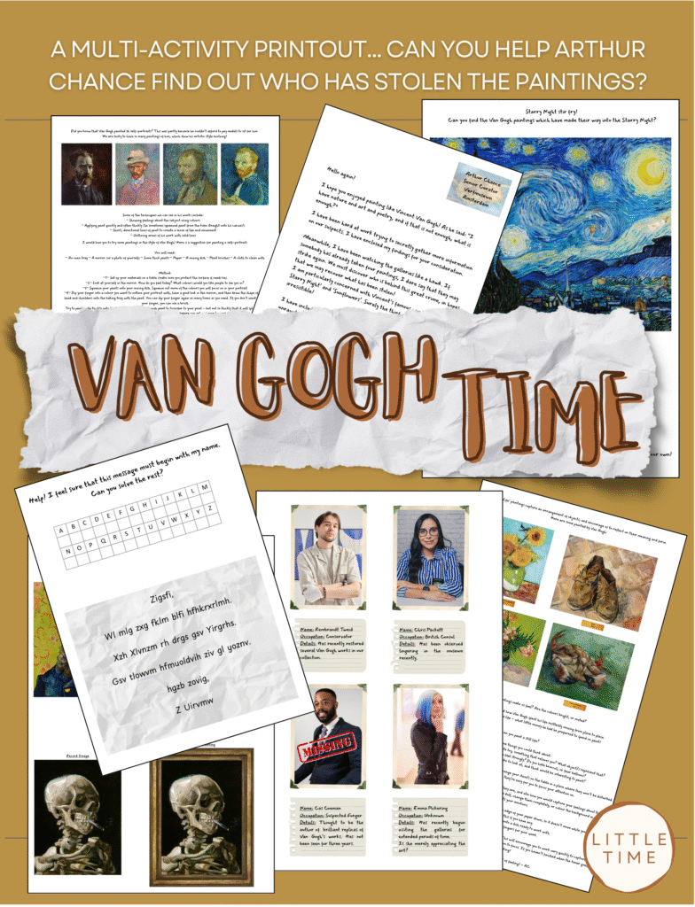 Aimed at ages 8+, this print-at-home activity pack is a series of communications from Arthur Chance, who has discovered Van Gogh’s paintings are being replaced by forgeries!